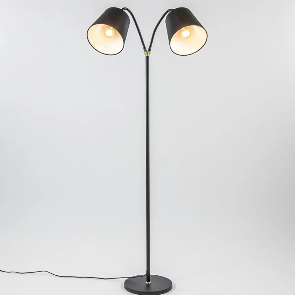 Deze 2-lichts vloerlamp is een echte sfeermaker voor in huis. De staande lamp is uitgevoerd in het mat zwart met gouden accenten en is te combineren in diverse woonstijlen. Het zwarte armatuur wordt bovenin gesplitst en loopt verder in twee flexibele armen met stoffen kappen. U kunt de armen gemakkelijk buigen en draaien zodat u de lamp zo kunt plaatsen dat hij voor u de beste lichtverspreiding creëert. U kunt de lamp gemakkelijk aan- en uitschakelen dmv de schakelaars op de fittingen. Zo kunt u beide kappen apart bedienen en hoeft u nooit in het snoer naar de schakelaar te zoeken. De vloerlamp is voorzien van een zwart snoer van 200 cm en wordt geleverd zonder lichtbron (2x E27)