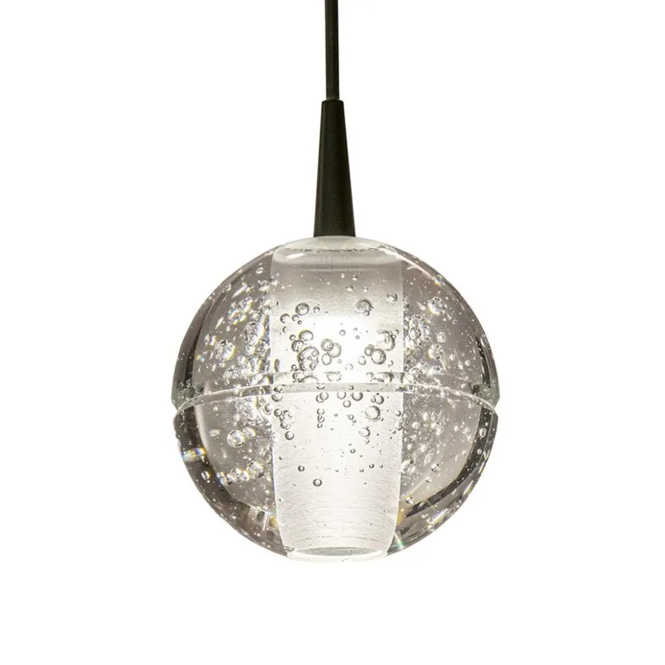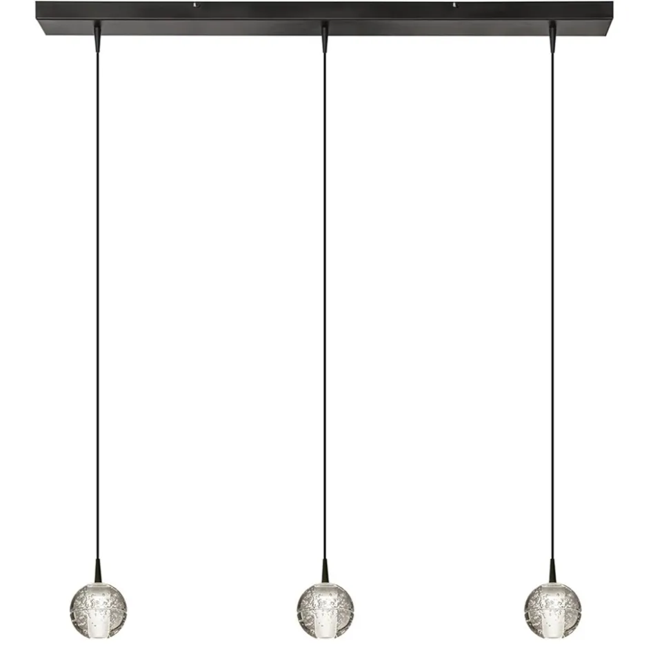 Een moderne hanglamp met een hoogwaardige kwaliteit glas. De glazen bollen zijn voorzien van een bubbel effect wat leuk oplicht wanneer de lamp wordt ingeschakeld. Binnenin de bol is het glas mat zodat er niet direct in de lichtbron kan worden gekeken. Dit is een LED lichtpunt die met 450 lumen per bol een flinke opbrengst geeft. Door middel van een externe dimmer (exclusief) zou de lamp gedimt kunnen worden. De helder glazen bollen hangen aan zwarte snoeren welke naar wens zijn in te korten. De maximale hoogte van de lamp is 135 cm. De moderne eettafelhanglamp is een fijne sfeermaker met een mooi effect.