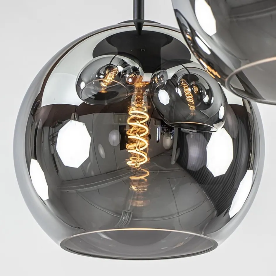 Met deze plafondlamp brengt u een luxe, modern en retro gevoel in huis. De 3-lichts plafondlamp is een mooie toevoeging voor een hal, woonkamer of slaapkamer. De plafondlamp heeft een grote plafondplaat waar 3 lichtpunten op zijn gemonteerd. Deze zijn verdeeld over diverse hoogtes voor een speels effect. De smoke/titanium glazen bollen geven een plafondlamp een luxe uitstraling. Het glas is enerzijds spiegelend, en anderzijds donker transparant, oftewel smoke. De grote plafondlamp heeft een hoogte van 52 cm en is dimbaar middels een externe dimmer (exclusief).