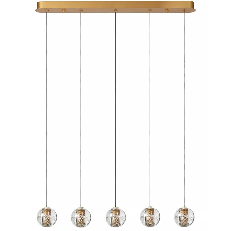 Breng de sfeer in de eetkamer naar een hoger niveau met deze sfeervolle 5-lichts LED hanglamp. De lamp wordt bevestigd met een langwerpige metalen balk die is uitgevoerd in het goud. Over de balk zijn 5 lichtpunten verdeeld die ieder naar wens op hoogte zijn te hangen. De maximale hoogte van de lamp is 150 cm. De kappen bestaan uit glazen bollen met een champagne effect in het glas en een gouden cilinder voor extra glamour. Het glas is van binnen voorzien van LED verlichting wat het glas en de ruimte voorziet van een sfeervol effect. De 5-lichts LED hanglamp is dimbaar middels een externe dimmer (exclusief).