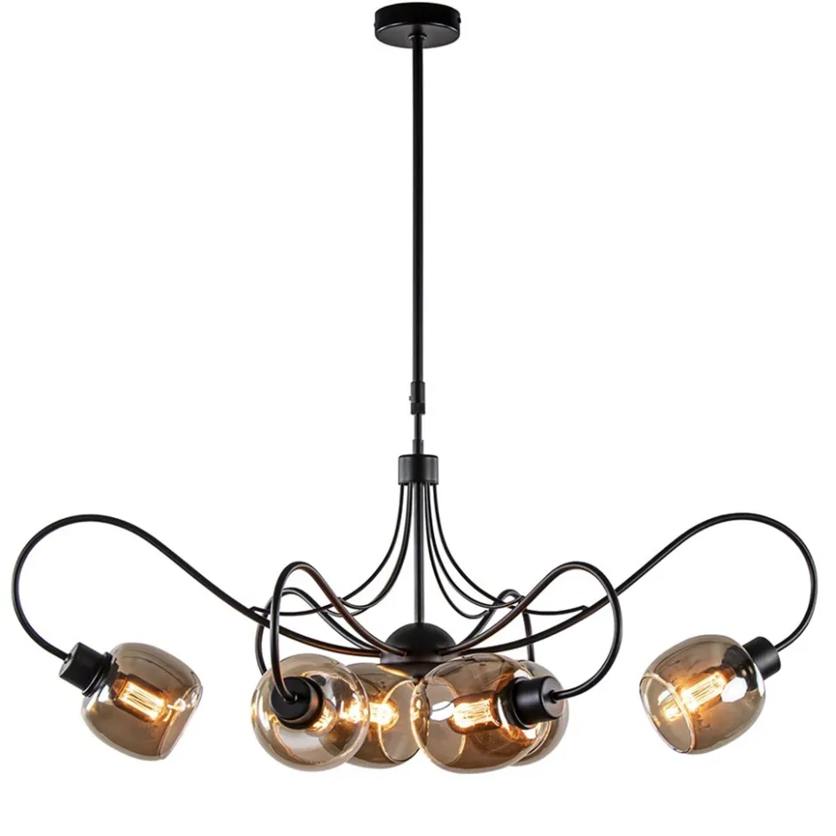 Een stijlvolle hanglamp met een sierlijk design. De hanglamp heeft een metalen armatuur dat is uitgevoerd in het mat zwart. De sierlijke armen geven de lamp een klassieke uitstraling. Het zwarte armatuur is mooi gecombineerd met smoke glas wat de lamp weer een trendy en chique look geeft. De hanglamp is in hoogte te verstellen met een minimale hoogte van 90 cm en een maximale hoogte van 125 cm. Ideaal voor boven een eettafel. De 6-lichts hanglamp met smoke glas wordt geleverd exclusief lichtbronnen en is dimbaar middels een externe dimmer (exclusief).