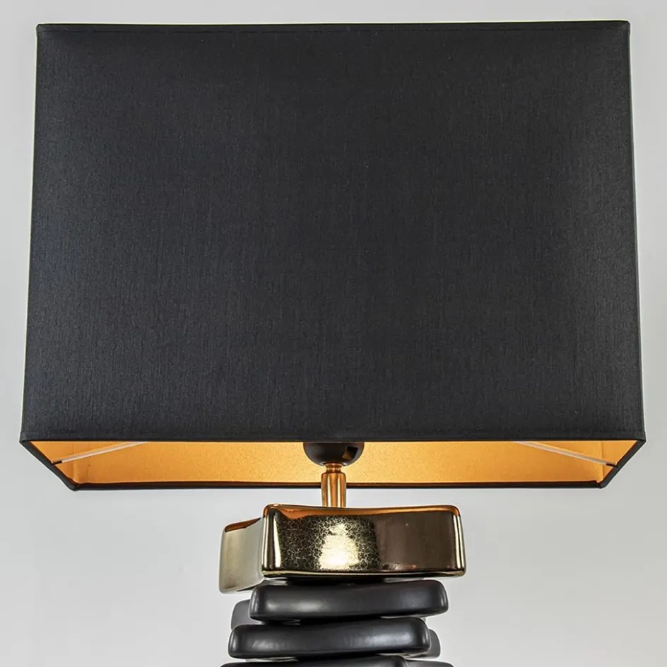 Deze stijlvolle tafellamp is een prachtig exemplaar voor op een dressoir, bijzettafel of zelfs het nachtkastje. Ga voor een chique hotel look in het interieur met deze zwarte tafellamp met goud accenten. De schemerlamp heeft een keramieken voet die is opgebouwd uit losse delen. Doordat deze verspringen ontstaat er een speels design wat, mede door het goud dat erin verwerkt is, een luxe uitstraling heeft. De voet is gecombineerd met een rechthoekige zwarte kap met gouden binnenzijde. De stijlvolle tafellamp heeft een zwart snoer met een lengte van 150 cm en een schakelaar op 30 cm. De lichtbron is exclusief.