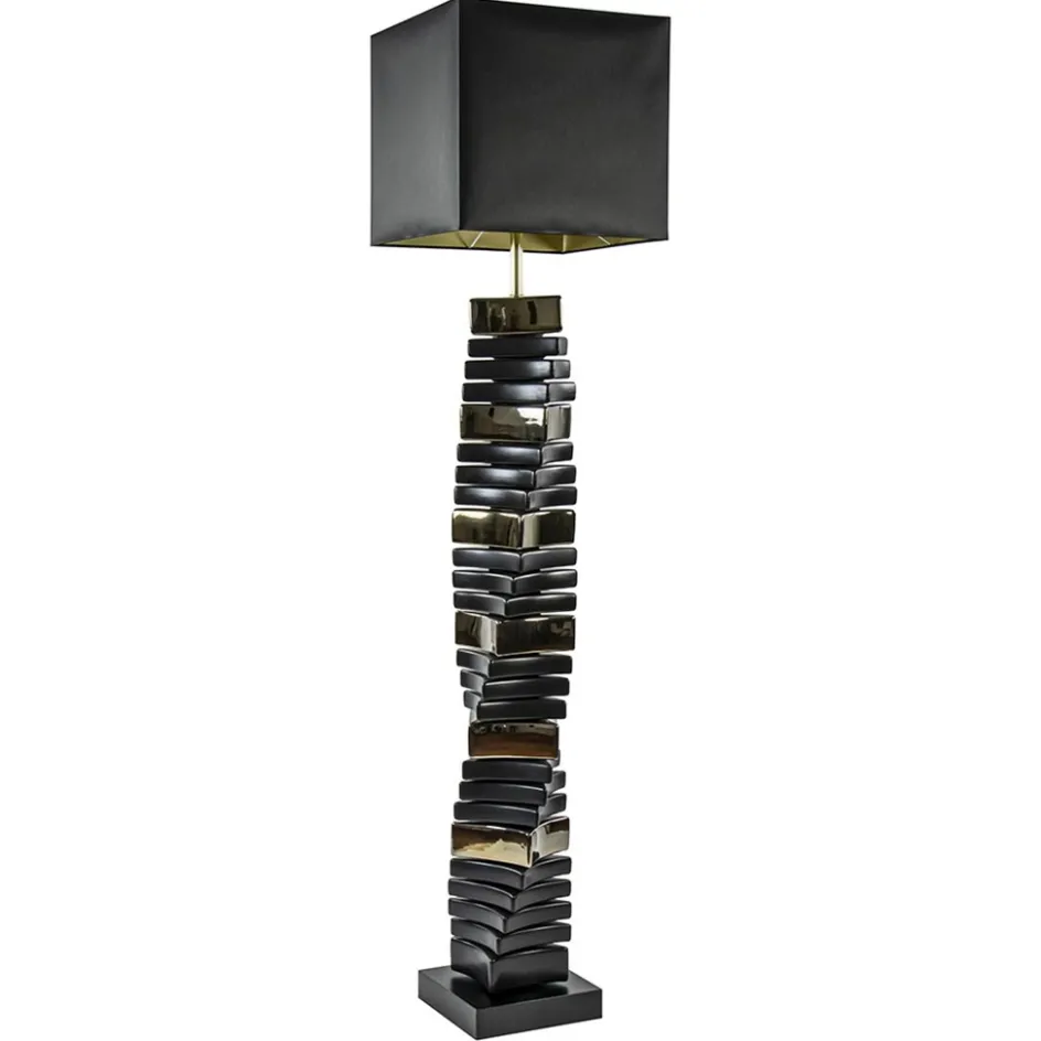Deze prachtige vloerlamp is een ware eyecatcher in het interieur. De staande lamp heeft een keramieken voet die is opgebouwd uit losse delen. Doordat deze verspringen ontstaat er een speels design wat, mede door het goud dat erin verwerkt is, een luxe uitstraling heeft. De voet is gecombineerd met een grote vierkante kap in het zwart/goud. De lamp is een verrijking voor uw woonstijl en staat prachtig naast de bank of in een donkere hoek. De staande schemerlamp is voorzien van een zwart snoer van 135 cm met een schakelaar op 15 cm en wordt exclusief lichtbron geleverd.