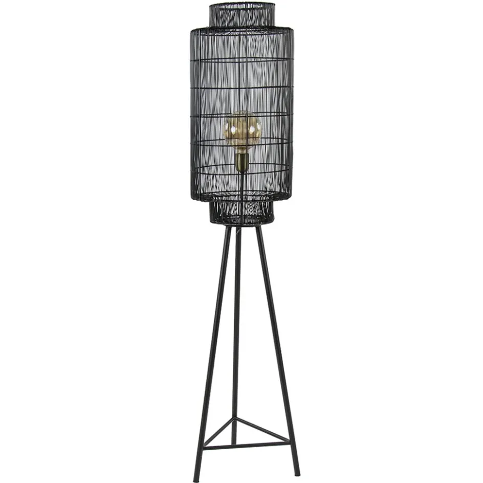 Een trendy vloerlamp in een mat zwarte uitvoering. De staande lamp is voorzien van een kap die is gemaakt van staaldraden wat een mooie en sfeervolle lichtverspreiding verzorgt. Voordeel is ook dat er niet direct in de lichtbron kan worden gekeken maar dat deze door de draden iets wordt bedekt. Binnenin de kap zit een bronzen fitting die zorgt voor een mooi accent. De kap wordt ondersteund door een mat zwarte driepoot en de vloerlamp wordt geleverd met een zwart snoer inclusief voetschakelaar. Het mat zwart combineert mooi in een modern interieur, maar past ook prima in een Scandinavisch of landelijk interieur. Vloerlamp Gruaro heeft een zwart snoer met een lengte van 330 cm en een voetschakelaar op 200 cm.