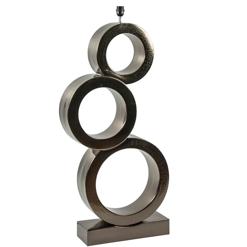 Deze prachtige vloerlamp is een kunstobject opzich in het interieur. De lampvoet is gemaakt van keramiek en uitgevoerd in de kleur brons. Door de glans krijgt de lampvoet een chique en luxe uitstraling. De drie ringen zijn op speelse wijze op elkaar geplaatst waardoor de lampvoet ook echt op een kunstobject lijkt. De luxe vloerlamp wordt geleverd zonder lampenkap en lichtbron. De lampvoet is voorzien van een zwart snoer van 185 cm, met een schakelaar op 90 cm.
