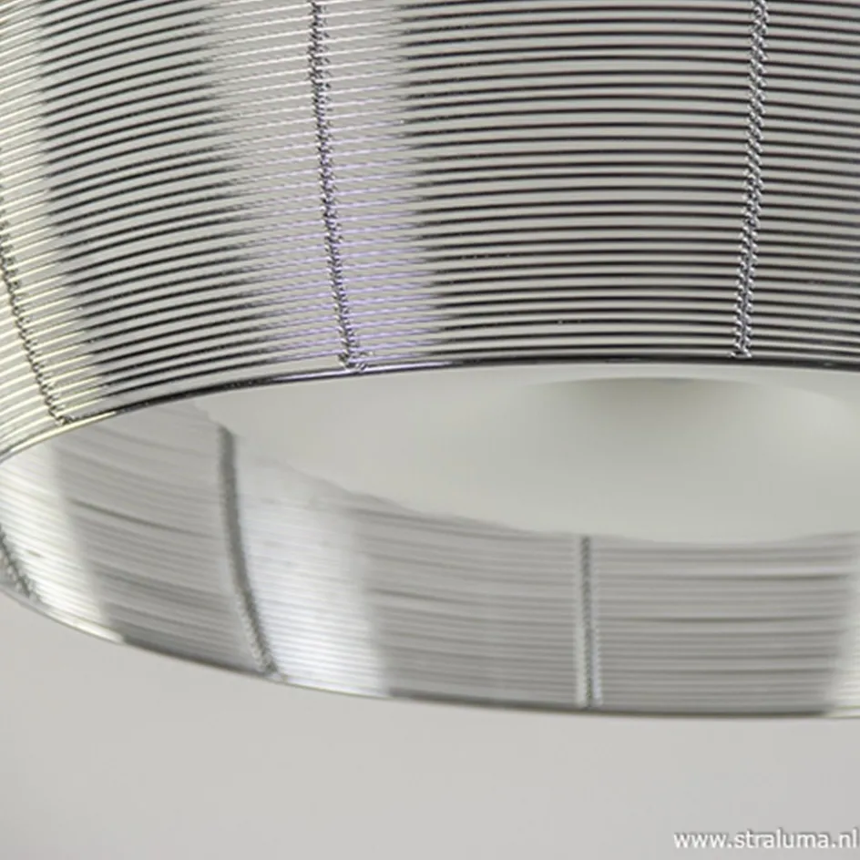Op zoek naar een plafondlamp-plafonnière die mag opvallen? Dan is dit wat u zoekt. De grote ronde kap van 50 cm is gemaakt van een zilveren frame waartussen zilveren ijzerdraden zijn gevlochten. Dit geeft de kap een draadlamp effect. Voordeel van deze lamp is dat deze van binnen is afgewerkt met een mat glazen kap, dit zorgt ervoor dat u niet direct in de lichtbron kijkt en het matte glas zorgt voor een warme en sfeervolle verlichting. De grote plafondlamp wordt met een chromen plafondplaat opgehangen. Door z’n grootte past de lamp mooi in een slaap- of woonkamer.