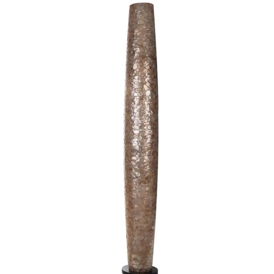 Deze cilindervormige vloerlamp doet denken aan de schil dvan een schildpad. De lamp is gemaakt met een fiberglas mal waar de capiz schelpen in zijn gelegd. Door de schelpen onstaat er een sfeervolle verlichting en brengt de lamp warmte en gezelligheid met zich mee. De schelpenkap staat op een zwarte ronde voet met zwart snoer en is van binnen voorzien van drie lichtpunten die het licht mooi verspreiden over de kap.