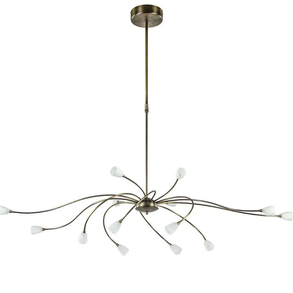 Een chique hanglamp voor boven een eettafel. Deze klassieke lamp heeft een ovale vorm en is op speelse wijze in elkaar gezet. Het armatuur is gemaakt van metaal en uitgevoerd in het brons. Door de combinatie met de wit gevlamde glazen kapjes krijgt de hanglamp echt die luxe klassieke uitstraling. En toch is de lamp ook modern. Deze is namelijk voorzien van geïntegreerd LED met een dim to warm functie. Dit houdt in dat de lamp kan dimmen in kleurtemperatuur tussen de 2200 en 2700 Kelvin. Dit werkt gemakkelijk met de dimmer onderop het armatuur. Door deze ingedrukt te houden bepaald u gemakkelijk en snel de juiste sfeer voor tijdens het dineren of natafelen. De bronzen LED hanglamp is verder op het armatuur nog in hoogte te verstellen door de stang in of uit te schuiven. De hoogte varieert van 80 tot 120 cm.