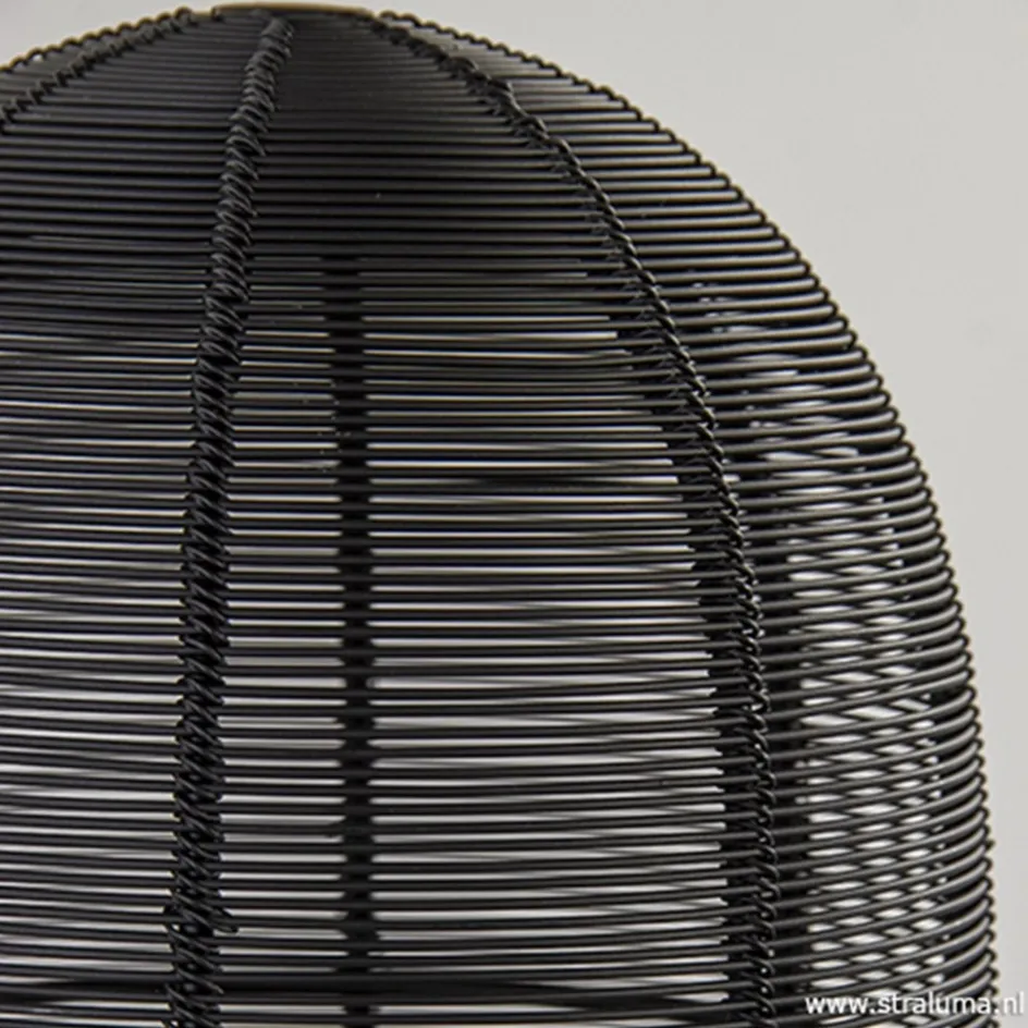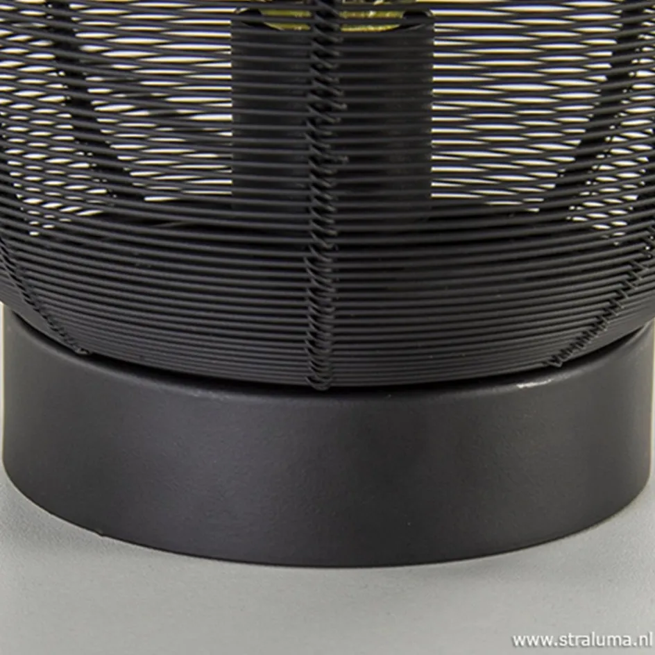 Klein maar wel stoer deze draad tafellamp. De zwarte tafellamp is gemaakt met een metalen frame waartussen de metaaldraden zijn gevlochten. Het leuke aan de kap is dat deze volledig dicht is, vaak zijn draadlampen deels open. De lamp gaat open door de schroeven in de metalen voet los te draaien en zo de lichtbron te verwisselen. Dit mat zwarte tafellampje past mooi op een dressoir of in een kast bij diverse woonstijlen als landelijk, industrieel of modern.