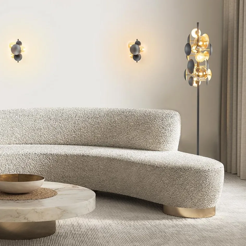 Deze futuristische vloerlamp is een ware eyecatcher in de ruimte. De lamp bestaat uit metalen plaatjes en amber glazen bollen die op speelse wijze zijn verdeeld over de lamp. Het metalen armatuur is uitgevoerd in het antraciet grijs met een gouden binnenzijde. Dit combineert mooi met het gouden glas. De glazen bollen zijn verdeeld over 3 maten en worden evenredig verdeeld over de lamp. De moderne vloerlamp wordt geleverd exclusief lichtbron en is voorzien van een zwart snoer met een lengte van 180 cm. De schakelaar bevindt zich op 30 cm van de voet.
