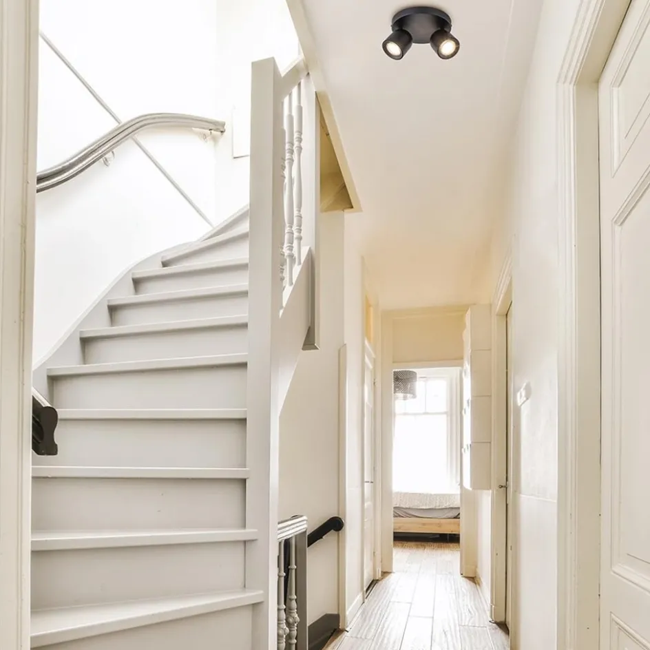 Ideaal voor het uitlichten van een donkere hoek, kunstobject of gewoon als extra sfeer in de ruimte. Deze 2-lichts ronde opbouwspot kan het allemaal. De spots zijn bevestigd op een ronde plafondplaat en zijn volledig naar wens te verstellen door deze te draaien en/of te kantelen. De zwarte spots worden geleverd exclusief lichtbron (GU10). De lichtbron wordt gemakkelijk geplaatst door het binnenkapje te verwijderen en weer terug te plaatsen. Leuk aan deze plafondspot is dat er ook een gouden kapje mee wordt geleverd zodat u zelf kunt kiezen welke u wilt toepassen.