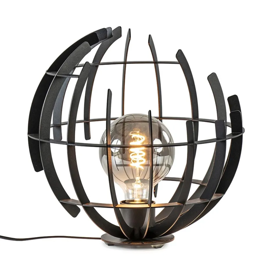 Deze stoere tafellamp heeft een mat zwarte metalen afwerking. Dit geeft de tafellamp een stoer uiterlijk. De kap van de tafellamp bestaat uit metalen ribben. De tafellamp krijgt een speels randje doordat de ribben verspringen. De ronde tafellamp ziet er dan ook van iedere zijde weer anders uit. De tafellamp heeft een snoer van 190 CM, de dimschakelaar bevindt zich op 40 CM van het armatuur. Let op, deze tafellamp wordt exclusief lichtbron geleverd.
