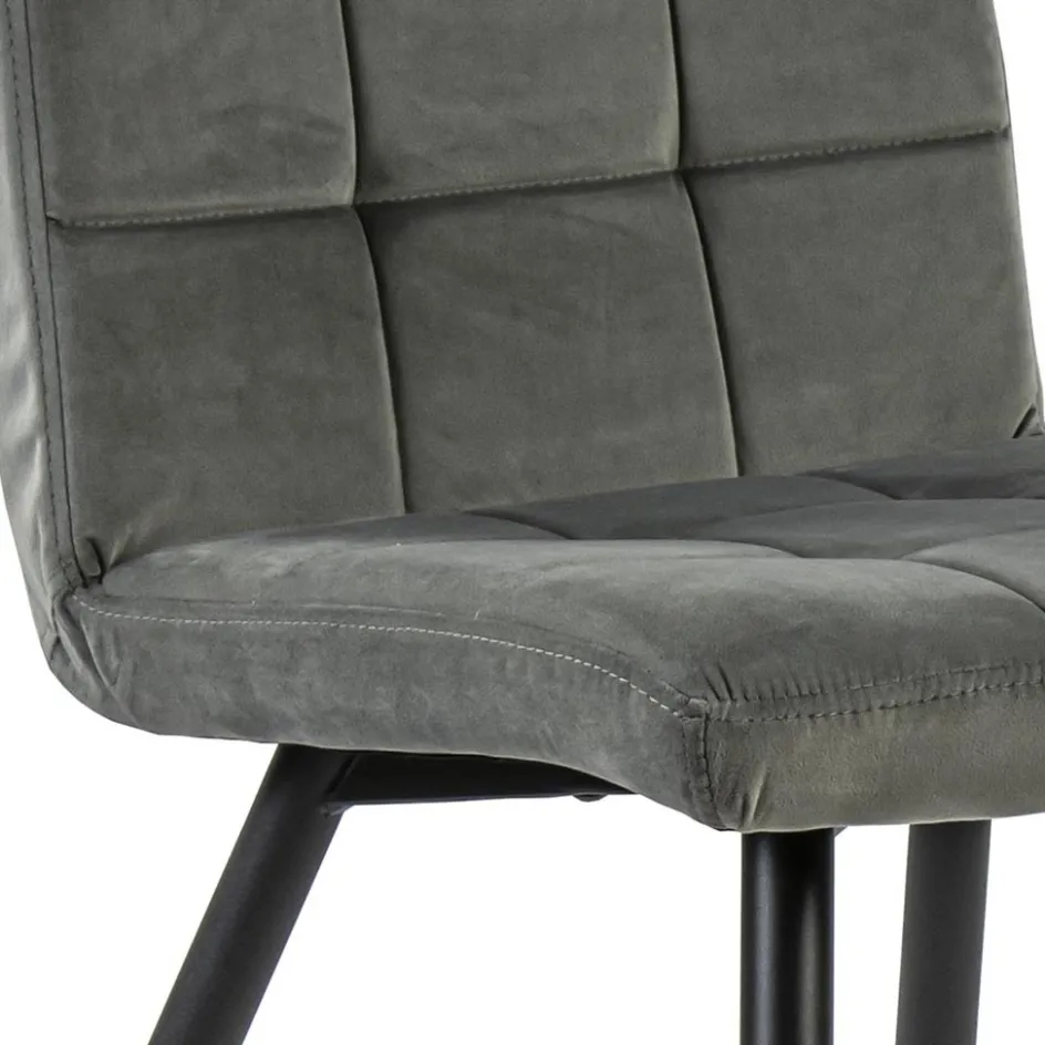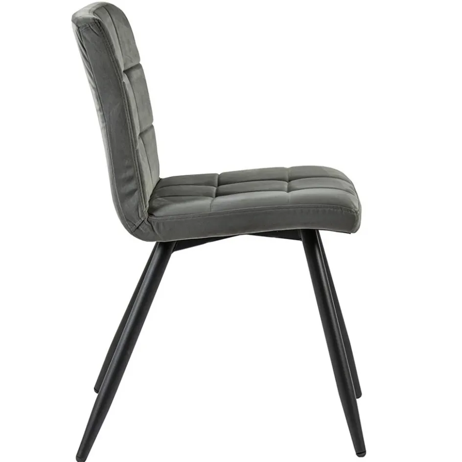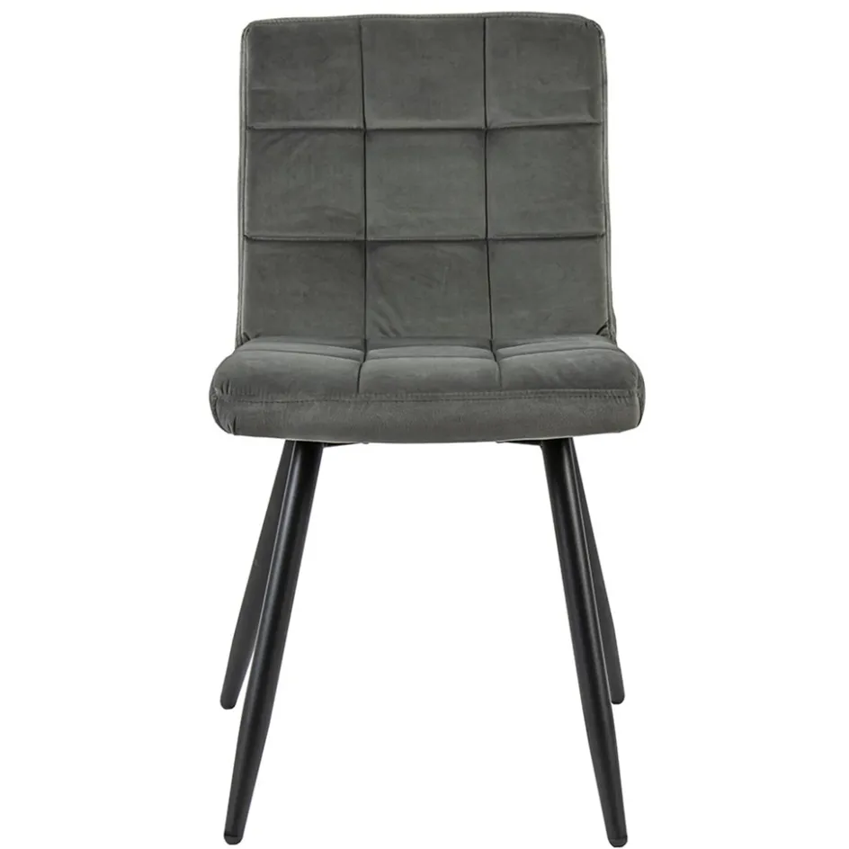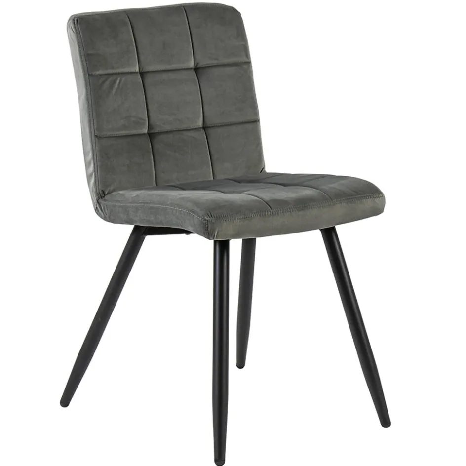 Een leuke hippe eetkamerstoel die mooi matcht met een houten tafel. De stoel heeft een stoffen zitting in het velours grijs. Dit geeft de eetkamerstoel een trendy look die door de zwarte metalen poten helemaal wordt afgemaakt. Zowel de zitting als de rugleuning zijn doorgestikt waardoor er vakken in de stof ontstaan.