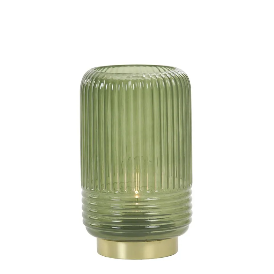 Dit tafellampje van glas met een goud/messing voetje is één en al sfeer. Het groene ribbel glas geeft het licht een prachtig effect. De ribbels in het glas lopen aan de onderkant horizontaal, daar boven zijn de ribbels verticaal. Dit geeft deze eenvoudig ogende tafellamp een bijzonder tintje. Fijn is ook dat het lampje werkt op 2 AAA-batterijen (excl), hierdoor is het echt overal te plaatsen. van de woonkamer tot de slaapkamer of de studentenkamer! Mooi in een romantisch, landelijk of botanisch interieur.