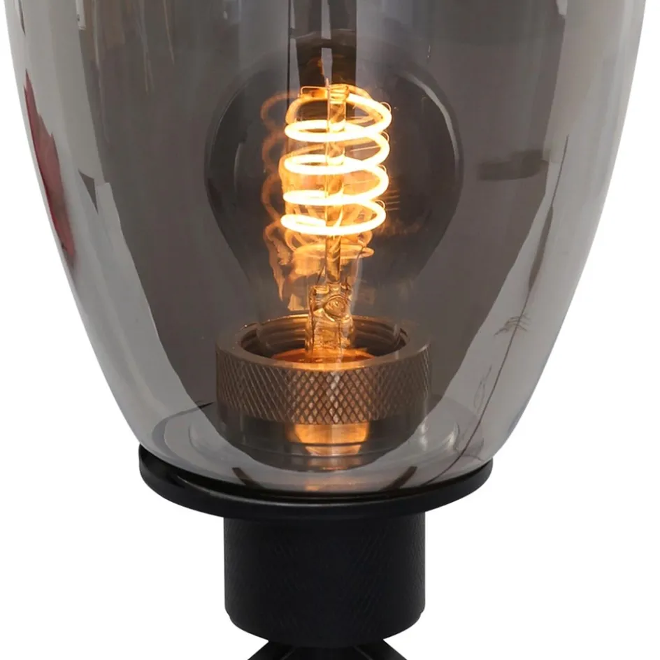 Een tafellamp uit een mooie serie. De zwarte tafellamp is voorzien van een driepoot voet met een zwarte fitting die de ovale kap ondersteund. De kap is gemaakt van donker spiegeld glas, oftewel smoke glas. Het donkere glas heeft een titanium look die de lamp een luxe uitstraling geeft. Het glas spiegeld wanneer de lamp is uitgeschakeld, schakelt u de lamp in dan kleur het glas donker transparant. De driepoot voet heeft een zwart stofomwonden snoer met een lengte van 150 cm en is voorzien van een knipschakelaar. De smoke glazen tafellamp wordt geleverd zonder lichtbron (E27).