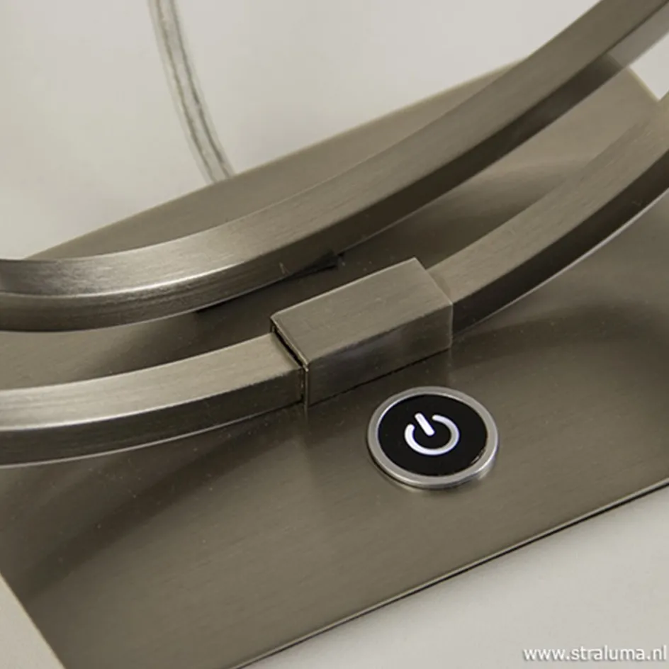 Een moderne LED tafellamp met touchdimmer. De metalen tafellamp in kleur nikkel is op de voet voorzien van een touchknop die drie dimstanden kent. De bogen van de lamp zijn volledig voorzien van LED strips wat een mooie sfeervolle verlichting geeft en ook nog eens energiezuinig is. Een ideale sfeermaker met modern design!