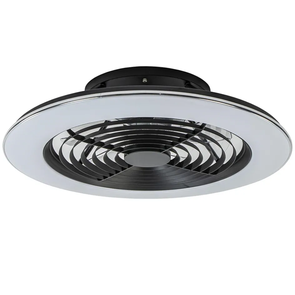 Een moderne variant van de klassieke plafondventilator. Deze zwart met chromen ventilator en plafondlamp inéén doorbreekt de standaard modellen met de losse bladen. Deze strakke ventilator bestaat uit twee delen, de buitenste ring is voorzien van geïntegreerd LED en de binnenste ring behuisd de ventilator. Het mooie is ook nog dat de ventilator en de lamp zijn te bedienen via de meegeleverde afstandsbediening, maar ook gemakkelijk met uw mobiel. Middels een app en bluetooth stelt u snel de gewenste snelheid van de ventilator in of dimt u de verlichting. Deze is in te stellen qua kleur en intensiteit, ideaal voor in de woonkamer of slaapkamer. Een ventilator is nog nooit zo strak en gemakkelijk bedienbaar geweest.