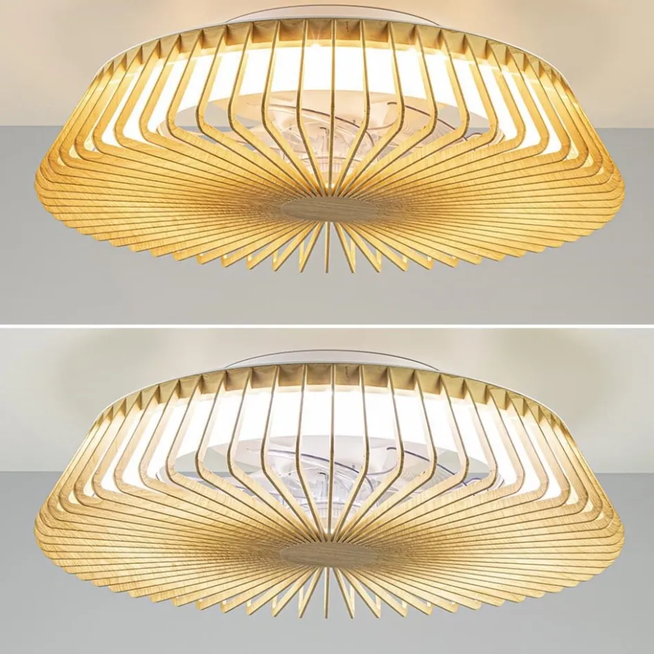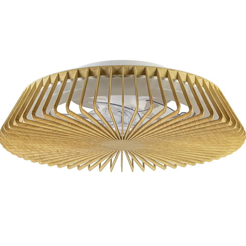 Een moderne design plafondventilator met LED zoals we deze nog niet eerder hebben gezien. De ronde ventilator oogt meer als een plafondlamp dan een ventilator maar deze heeft beide functies in één. De fraaie kap met hout-look geeft de plafondventilator een frisse uitstraling. De moderne plafondventilator, met ledlichtbron, is voorzien van diverse functies. Zo kunt u de kleurtemperatuur kiezen tussen de 2700 en 5000 Kelvin en kunt u de lamp eenvoudig dimmen. Dit bediend u allemaal gemakkelijk met de bijgeleverde afstandsbediening of via een app op uw mobiele telefoon. Deze verbindt u d.m.v. Bluetooth met de lamp zodat u vanaf uw bank, bed of luie stoel snel de gewenste instelling kunt maken. Kortom, een ideale plafondlamp en ventilator in één met een mooie design uitstraling.