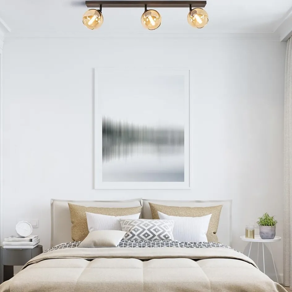 Mooie mat zwarte 3-lichts plafondlamp met amber glas. De fittingen zijn 350 graden te draaien waardoor u de lamp eigen kunt maken. Deze plafondlamp is een mooie aanvulling in een hal of woonkamer. De amber kleurige glazen bollen geven de plafondlamp een luxe warme uitstraling, perfect voor een klassiek of retro interieur. De 3-lichts plafondlamp wordt zonder lichtbronnen geleverd. De lamp is dimbaar met de juiste dimmer (exclusief).