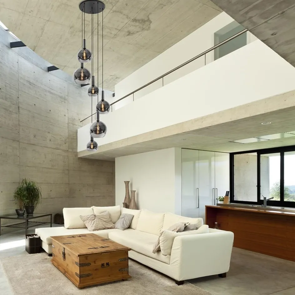 Een prachtige hanglamp voor in de vide of een ruimte met een hoog plafond. Deze 6-lichts hanglamp heeft namelijk een hoogte van maar liefst 4 meter. De videlamp wordt aan het plafond bevestigd met een grote mat zwarte ronde plaat van 45 cm doorsnede. De kappen zijn naar wens te verdelen door middel van de trekontlasters. Zo kunt u een mooie verdeling maken die het beste bij de ruimte past. De kappen zijn verdeeld onder 3 afmetingen en bestaan uit een mat zwarte cilindervormige fitting met een smoke/titanium glazen bol. Deze combinatie geeft de hanglamp een luxe chique uitstraling die mooi matcht in diverse woonstijlen. De 6-lichts videlamp met smoke glas is dimbaar middels een externe dimmer (exclusief) en wordt exclusief lichtbronnen geleverd.