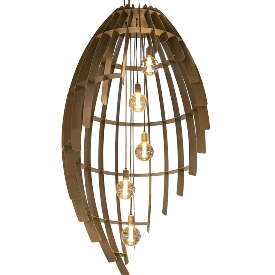 Met deze prachtige hanglamp weet u zeker dat u een statement maakt in uw woning. De grote hanglamp heeft een doorsnede van 98 cm en een hoogte van 180 cm. Dit maakt de lamp perfect voor in een vide of ruimte met een hoog plafond. De grote kap is volledig vervaardigd van metaal en uitgevoerd in het oxide (brons). Dit geeft de videlamp een chique uitstraling die mooi is toe te passen in diverse woonstijlen, van chic tot industrieel. De metalen kap heeft een open structuur die ook verspringt. Hierdoor krijgt de lamp vanuit iedere hoek een andere look. Binnenin de kap is de lamp voorzien van 5 lichtpunten met een E27 fitting. De grote metalen kap wordt opgehangen aan een stevige ketting die op lengte is te maken. Deze prachtige videlamp maakt het interieur helemaal af.