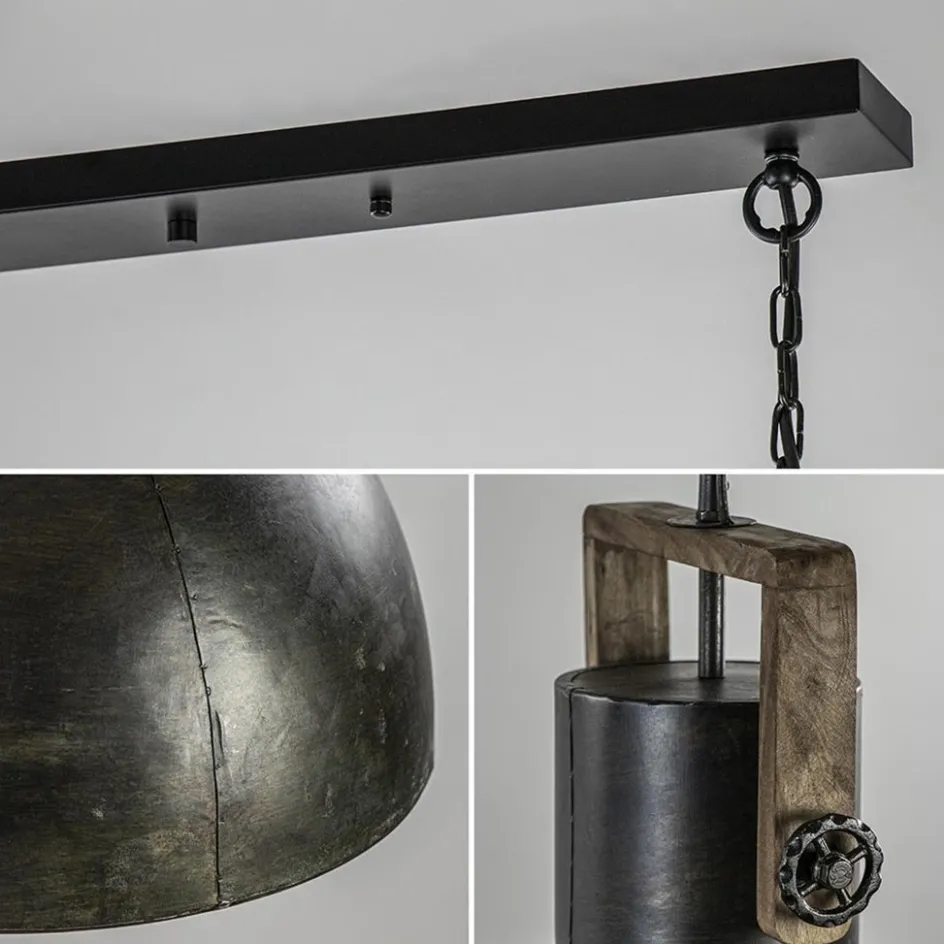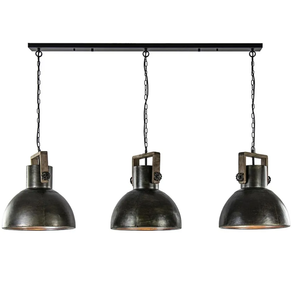 Een mooie robuuste hanglamp, deze 3-lichts hanglamp staal met hout. De combinatie van de materialen zorgt dat de lamp in zowel een landelijk als industrieel interieur prima te combineren is. De grove metalen kappen ogen alsof deze al flink wat te verduren hebben gehad en krijgen daardoor een stoere vintage look. De houten beugel waar de kappen aan hangen maakt dat gevoel extra af met de metalen draaiknoppen. De grote 3-lichts hanglamp is een mooie toevoeging boven een stoere houten tafel met stalen onderstel zoals nu een veel geziene trend is. De kappen hangen aan een ketting en een zwart snoer die beide naar wens zijn in te korten. De landelijke hanglamp wordt met een zwarte balk van 130 cm aan het plafond bevestigd. De 3-Lichts hanglamp Shelly landelijk metaal met hout wordt geleverd zonder lichtbron (3x E27). De binnenzijde van de koepel is zilver kleurig.