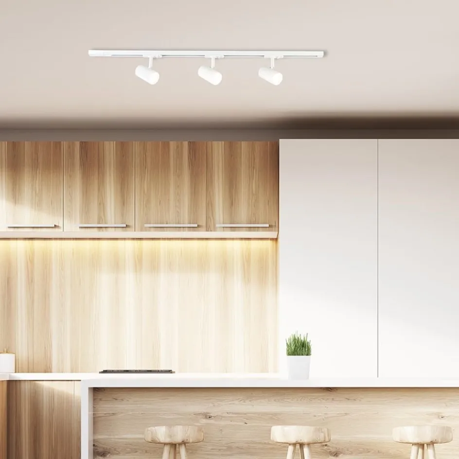 Ideaal om een ruimte extra uit te lichten of meer sfeer aan te brengen. Dit 1-fase railsysteem wordt geleverd inclusief 3 spots, beide uitgevoerd in het wit. De rail heeft een lengte van 100 cm waar de spots gemakkelijk op kunnen worden verdeeld. Druk de spot in de rail en zet hem vast door de knop om te zetten. De spots kunnen verder nog draaien en kantelen. Bepaal dus zelf hoe u het licht wilt verspreiden. Het railsysteem heeft 1-fase, dit houdt in dat alle lampen tegelijk zullen worden in- en uitgeschakeld. Handig voor in een lange hal of slaapkamer, maar ook in de keuken of woonkamer past dit systeem perfect. De smalle rail en de cilindervormige spots geven een strak en modern geheel aan de ruimte. Het witte railsysteem is dimbaar met een externe dimmer.