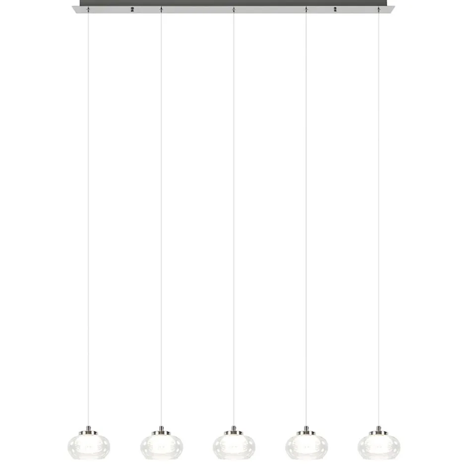 Deze moderne hanglamp is dé ideale lamp voor boven uw eettafel. De 5-lichts LED hanglamp heeft een mooi strak design en is voorzien van een 3-standen functie. Dit houdt in dat de lamp in 3 standen is te dimmen, en dat gewoon via de wandschakelaar. Schakelt u de lamp aan, dan brand deze op zijn felst, zet u de lamp uit en weer aan dan dimt deze naar de volgende stand. Herhaalt u dit? Dan brand de lamp op zijn zachts. Zo creëert u gemakkelijk en snel de juiste sfeer om bij te werken of te dineren. De hanglamp is verder voorzien van chromen details en helder glazen kappen. Het heldere binnenglas zorgt voor een mooi effect en tevens voor een fijne lichtverspreiding. Met 2700 Kelvin geeft de LED hanglamp een sfeervolle warm-witte verlichting die geschikt is voor iedere situatie. De combinatie van het chroom met het glas zorgt dat de lamp in diverse woonstijlen is te combineren.