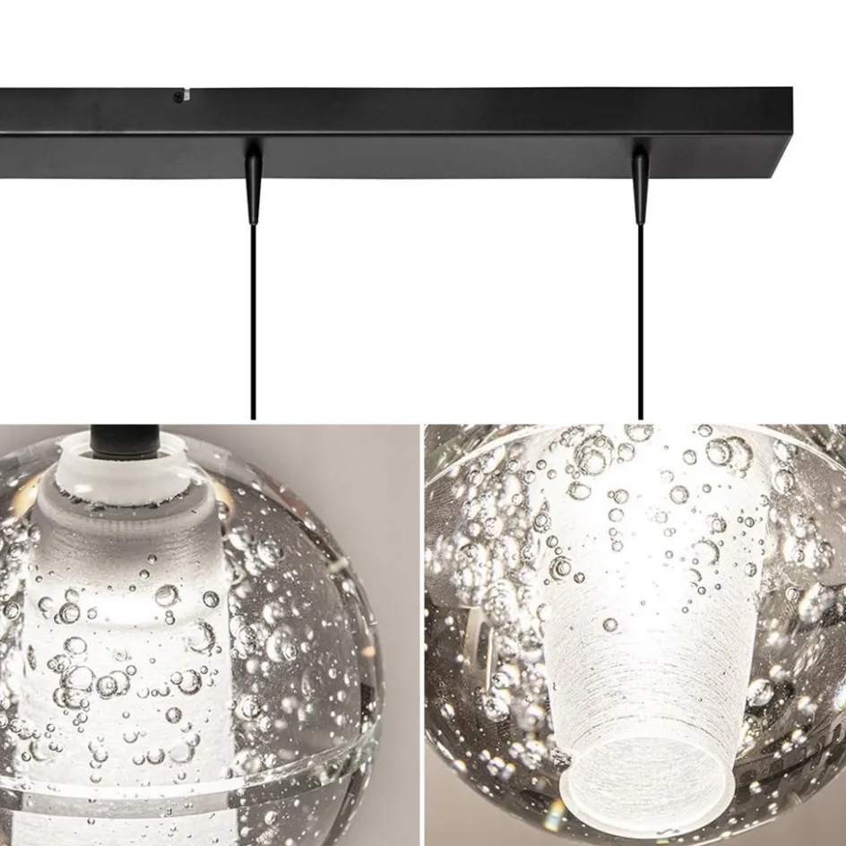 Een moderne hanglamp met een hoogwaardige kwaliteit glas. De glazen bollen zijn voorzien van een bubbel effect wat leuk oplicht wanneer de lamp wordt ingeschakeld. Binnenin de bol is het glas mat zodat er niet direct in de lichtbron kan worden gekeken. Dit is een LED lichtpunt die met 450 lumen per bol een flinke opbrengst geeft. Door middel van een externe dimmer (exclusief) zou de lamp gedimt kunnen worden. De helder glazen bollen hangen aan zwarte snoeren welke naar wens zijn in te korten. De maximale hoogte van de lamp is 135 cm. De moderne eettafelhanglamp is een fijne sfeermaker met een mooi effect.