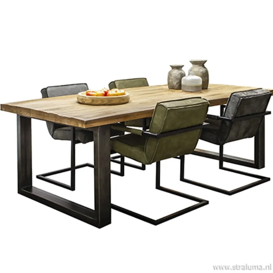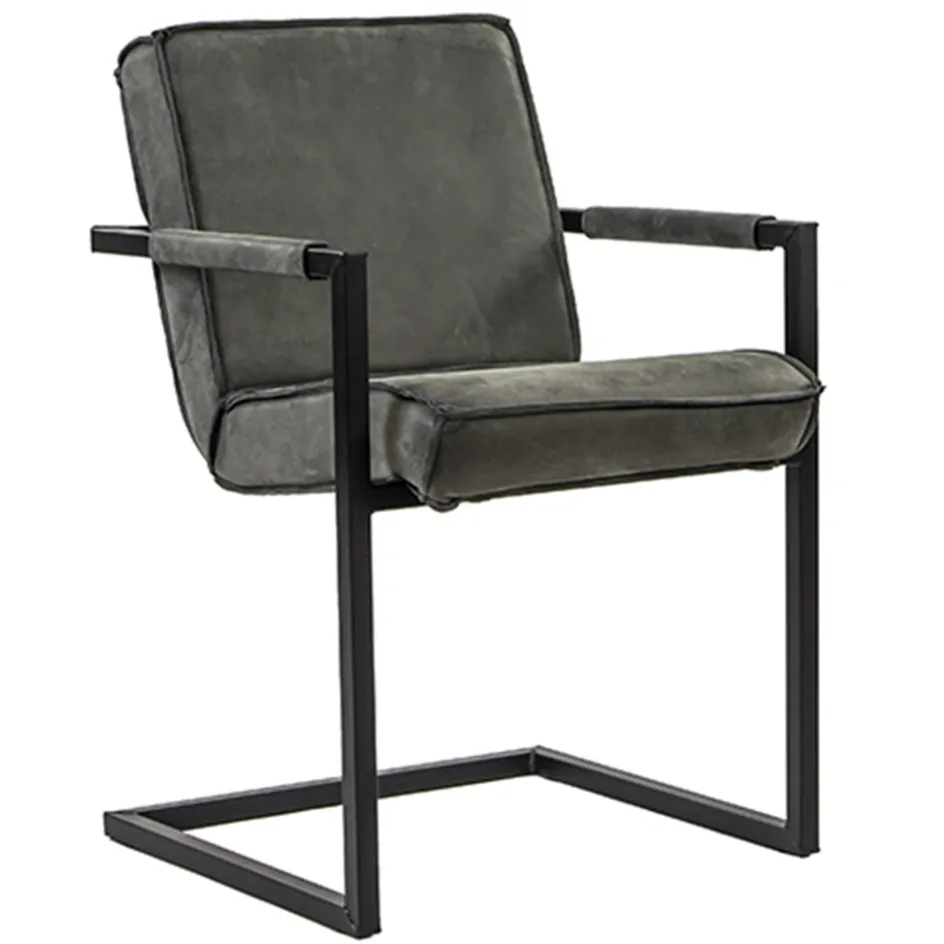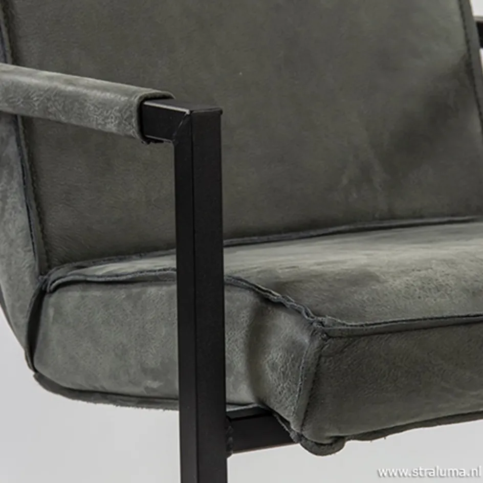 Een trendy modern/landelijke eetkamerstoel uitgevoerd in leder met metalen poten. Het olijf groene leder is van hoge kwaliteit en kan wel tegen een stootje. De dikke kussens zorgen in zowel de rug als de zitting voor een hoog zitcomfort en de metalen armleuningen die zijn voorzien van een leder stuk zorgen ook bij het natafelen voor een ontspannen en relaxte houding aan tafel.