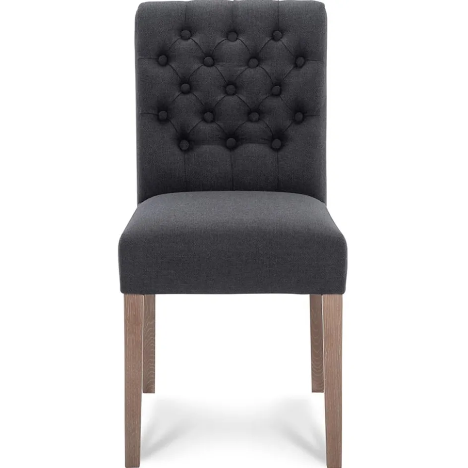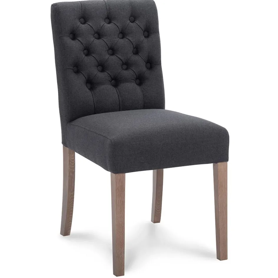 Comfortabel, sfeervol en toepasbaar in diverse woonstijlen als klassiek of landelijk. Deze eetkamerstoel maakt de eetkamer helemaal af en zorgt ervoor dat dineren nog fijner wordt. De stoel heeft een stoffen zitting die is uitgevoerd in het antraciet. De rugleuning is net als de zitting van stof en voorzien van decoratieve knopen die de stoel een chique uitstraling geeft. De eiken poten geven de stoel een stevig en robuust geheel.
