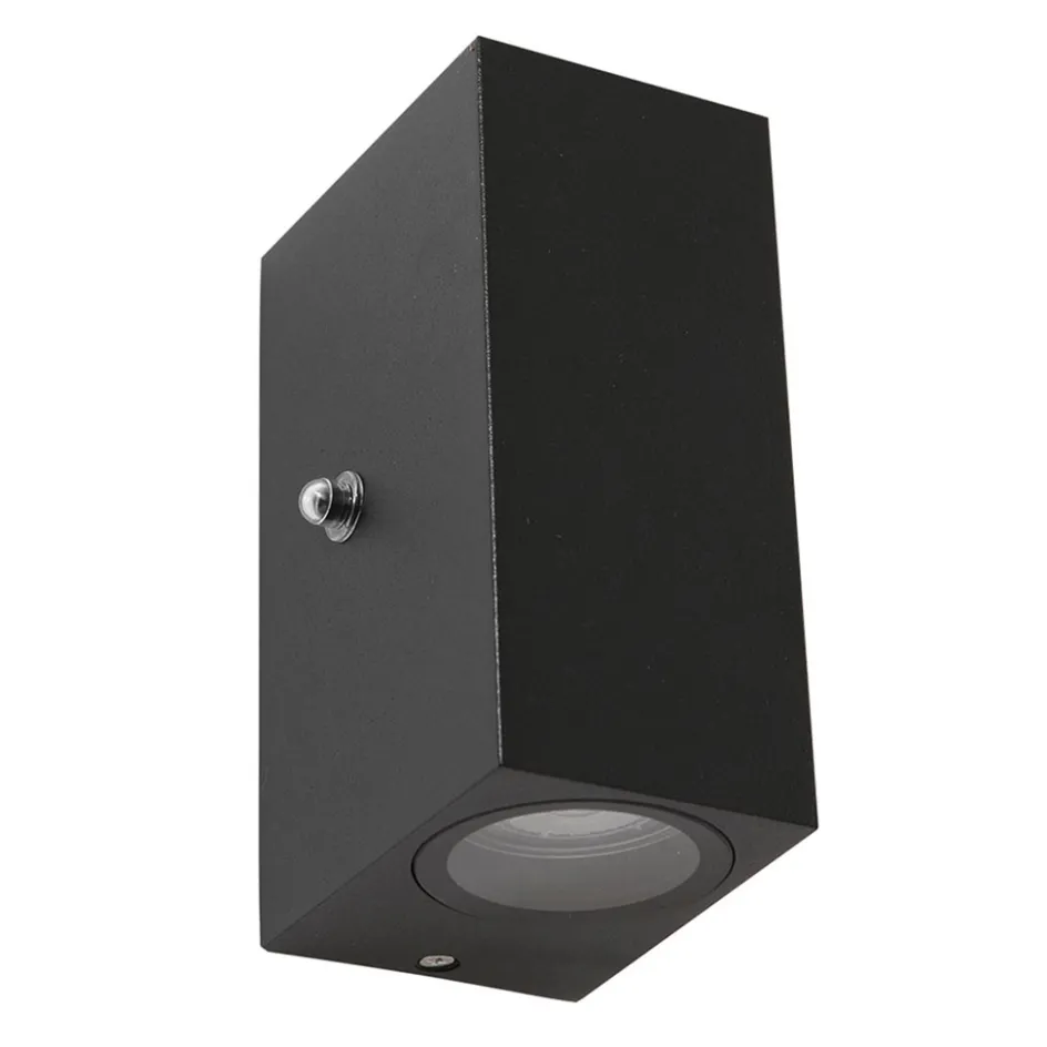 Een moderne up en down lighter die uw tuin nog meer sfeer geeft. De buiten wandlamp is rechthoekig en heeft een strakke afwerking. Het metalen armatuur is uitgevoerd in met zwart en heeft boven en onder helder glas. Achter het glas zitten de GU10 LED lichtbronnen welke energiezuinig zijn. Doordat de LED wandlamp zowel naar boven als onder verlicht ontstaat er een sfeervol zandloper effect op de ondergrond. Het zwarte armatuur is verder voorzien van een light sensitive switch, oftewel een lichtsensor, die zorgt dat de lamp automatisch aan en uit schakelt. Ideaal voor aan de schuur of schutting. De LED wandlamp is IP44 goedgekeurd.