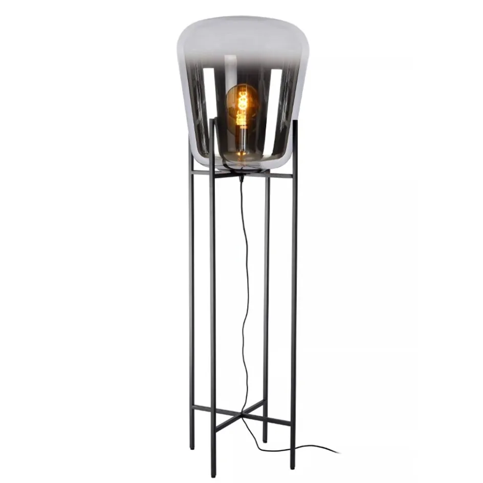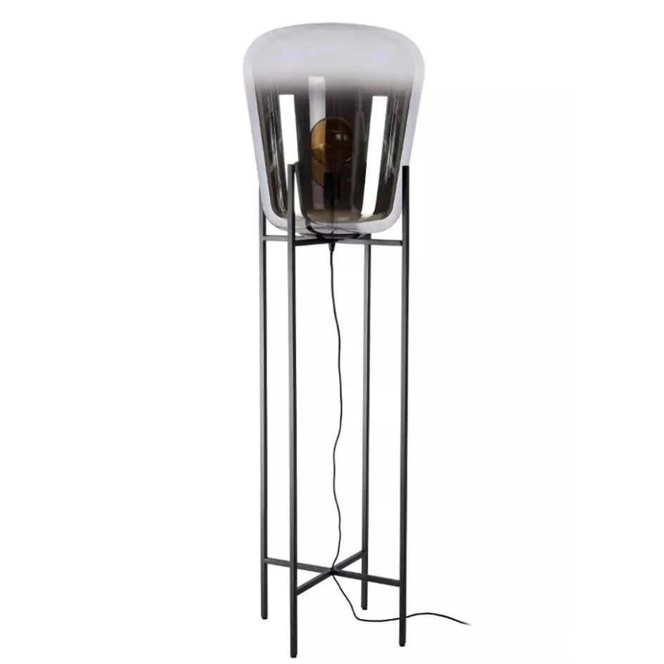 Deze elegante vloerlamp maakt het interieur helemaal af. De vloerlamp bestaat uit een metalen frame als voet die is uitgevoerd in het zwart en een smoke glazen kap met een verloop naar helder. Het donkere glas geeft de staande lamp een chique luxe uitstraling die mooi matcht met de huidige woontrends. De grote vloerlamp zorgt met diffuus licht voor een fijne sfeer. De glazen lamp is voorzien van een zwart snoer met een lengte van 180 cm. De lichtbron is exclusief.