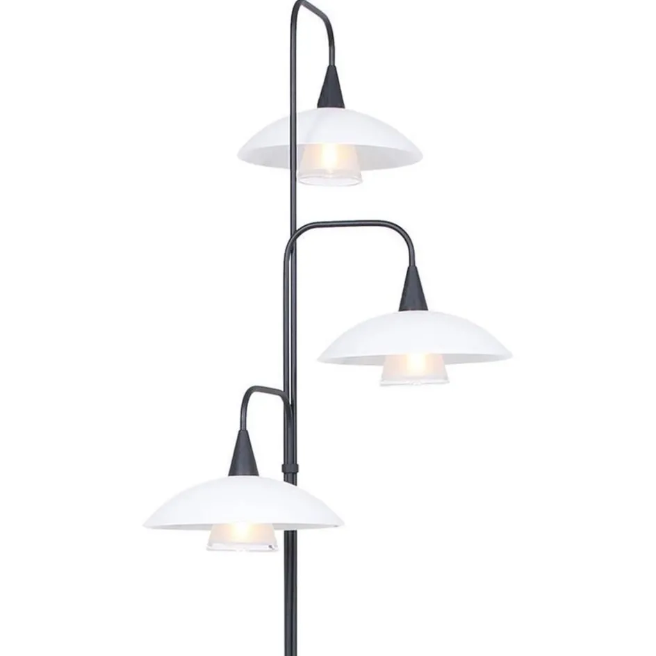 Een sierlijke vloerlamp met een moderne look en feel. Deze 3-lichts staande lamp is vervaardigd van metaal en uitgevoerd in het zwart. De vloerlamp is voorzien van LED verlichting welke, door middel van de dimmer op het armatuur, ook gemakkelijk te dimmen is. Met één druk op de dimmer zet u de lamp aan of uit, houdt u deze ingedrukt dan dimt de lamp totdat u weer loslaat. Ideaal om snel de gewenste sfeer te maken. In de witte schotels zit een binnenglas verwerkt die er voor zorgt dat u niet direct in de lichtbron kunt kijken. De drie armen zijn een beetje te draaien zodat u de drie kappen mooi kan verspreiden. De LED vloerlamp heeft een zwart snoer met een lengte van 195 cm.