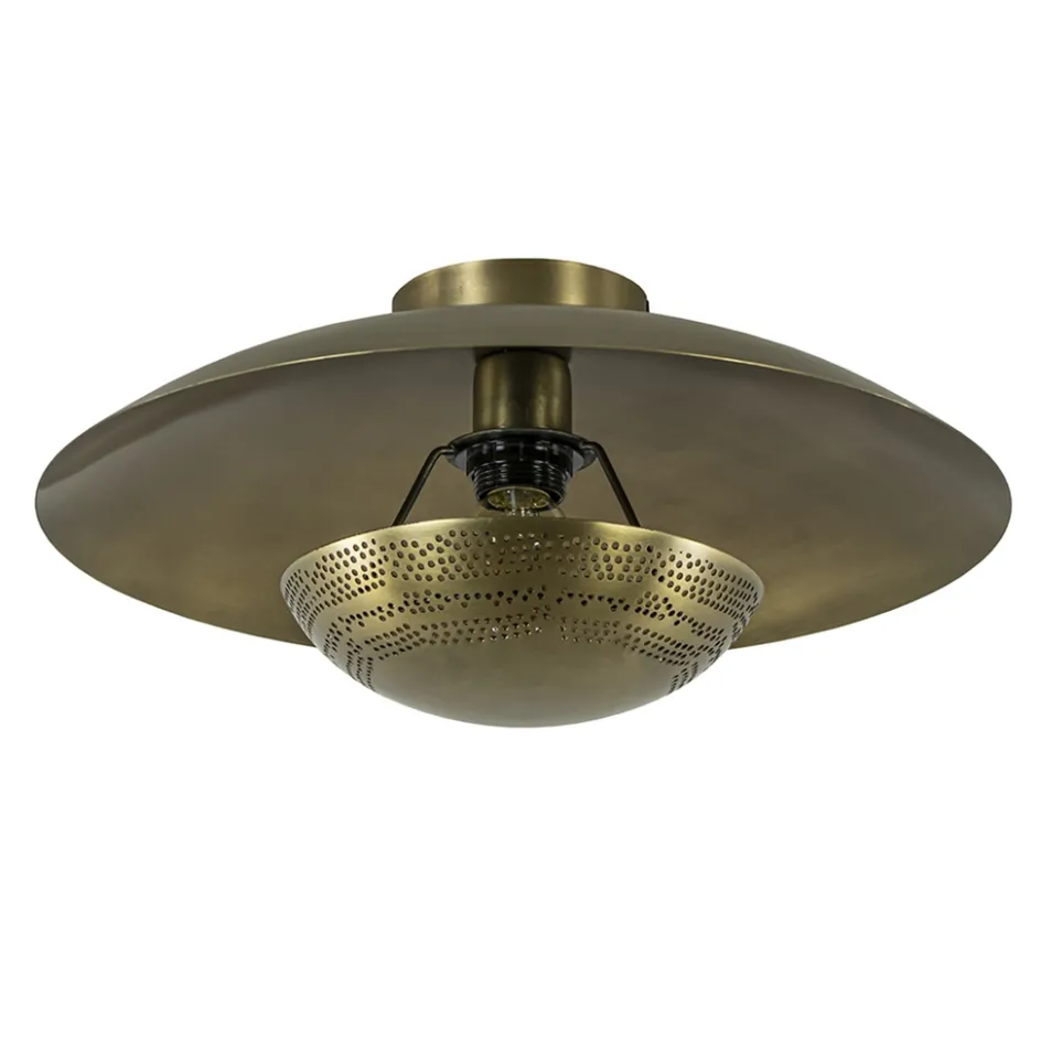 Een unieke plafondlamp met een elegante uitstraling. De plafondlamp is volledig gemaakt van metaal en uitgevoerd in het antiek brons. Dit maakt de plafondlamp prima geschikt voor diverse woonstijlen. De ronde schaal behuist een E27 fitting die mooi is weggewerkt door een geperforeerde kap. Op deze wijze kan er niet in de lichtbron worden gekeken maar geeft de plafondlamp wel voldoende sfeerlicht en een mooi lichtverspreiding. Doordat er niet direct in de lichtbron kan worden gekeken is de plafondlamp ook prima geschikt om als wandlamp toe te passen. Dit brengt wat extra dimensie aan het interieur. De antiek bronzen plafond- wandlamp wordt geleverd exclusief lichtbron en is dimbaar middels een externe dimmer (exclusief).