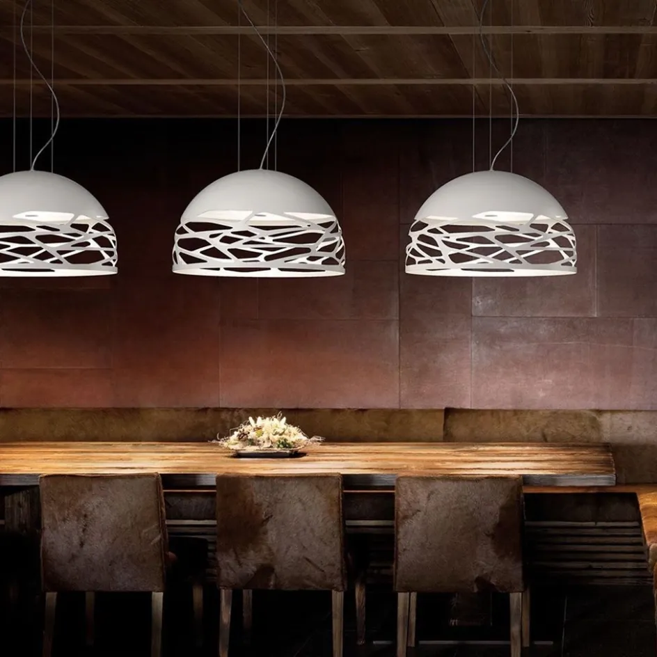 Deze prachtige koepel vormige hanglamp is een sterk staaltje Italiaans design. Staat super in een design of modern interieur. Uitgevoerd in wit metaal met een mat glazen diffuser, zo kijkt u niet direct in de lichtbronnen. De mooie opengewerkte rand geeft een prachtig licht/schaduw spel zowel wanneer de lamp brand als wanneer deze uit is. Met deze design hanglamp maakt u direct een statement.