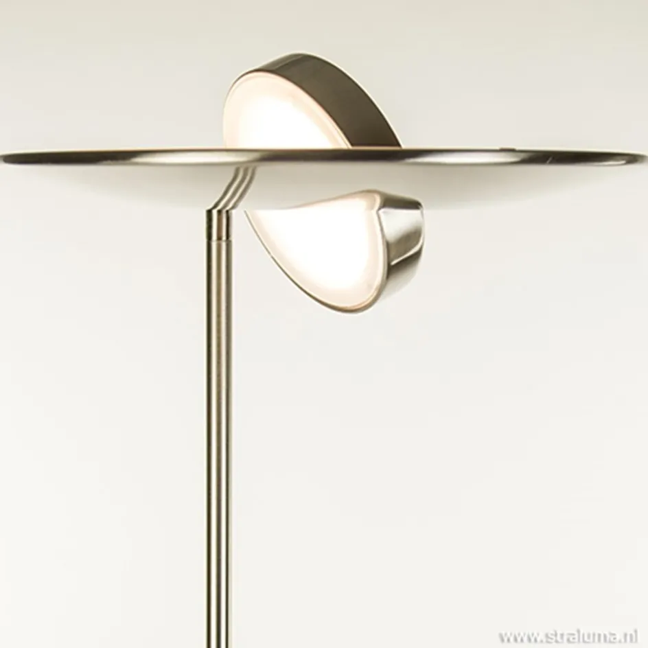 Deze moderne vloerlamp in een staal kleur is een mooie toevoeging aan uw interieur. De staande lamp is voorzien van een uplighter en een leeslamp voor extra gemak. Voordeel van de uplighter is dat de middenspot zowel naar onder als naar boven kan schijnen. De spot is gemakkelijk te draaien naar een gewenste positie. Ook de schaal zelf is te kantelen voor de juiste manier van belichten. Het leeslampje is ook te verstellen en heeft als leuk extraatje een speels licht effect aan de bovenzijde. Deze strakke vloerlamp is voorzien van LED lichtbron en is in vier kleuren verkrijgbaar: brons, staal, messing en zwart. Beide lichtbronnen zijn afzonderlijk van elkaar te dimmen.