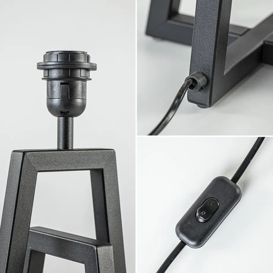 Moderne stoere tafellamp. Deze stoere tafellamp bestaat uit twee delen die speels door elkaar heen lopen. Het mat zwarte metaal geeft de tafellamp een stoer uiterlijk. U maakt de tafellamp naar eigen smaak met een door u uitgekozen kap. De tafellamp past mooi op een dressoir, nachtkastje of bijzettafel. Het armatuur heeft een snoer van 165 CM, de schakelaar bevindt zich op 40 CM van het armatuur. Deze tafellamp wordt exclusief lichtbron en kap geleverd.