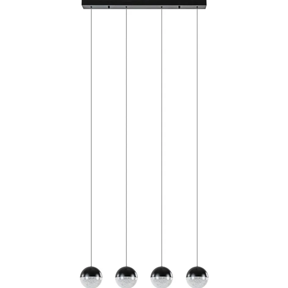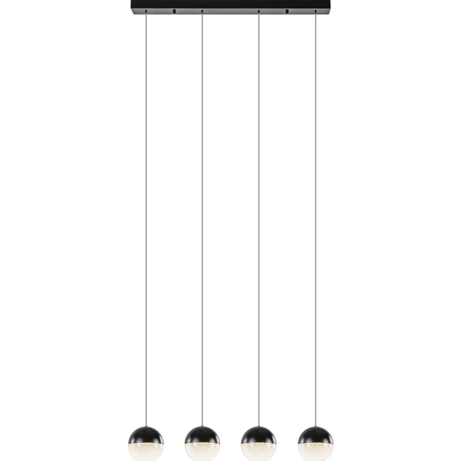 Een leuke moderne hanglamp met een sfeervol effect. Deze 4-lichts hanglamp zwart is gecombineerd met diamant zand wat voor een sfeervolle verlichting zorgt. Ideaal aan de LED-hanglamp is ook dat deze is voorzien van een 3-standen functie. Dit houdt in dat u de lamp gemakkelijk kunt dimmen d.m.v uw wandschakelaar. Er is dus geen externe dimmer nodig. Met een druk op de knop schakelt u snel tussen de 3 scènes en creëert u gemakkelijk de gewenste sfeer. Ideaal tijdens het dineren en natafelen. De vier bollen zijn half zwart en half diamant zand wat mooi is verwerkt in een kunststof kap. De LED bollen hangen aan soepele draden die naar wens zijn in te korten en de 4-lichts LED hanglamp wordt met een zwarte plafondbalk opgehangen.