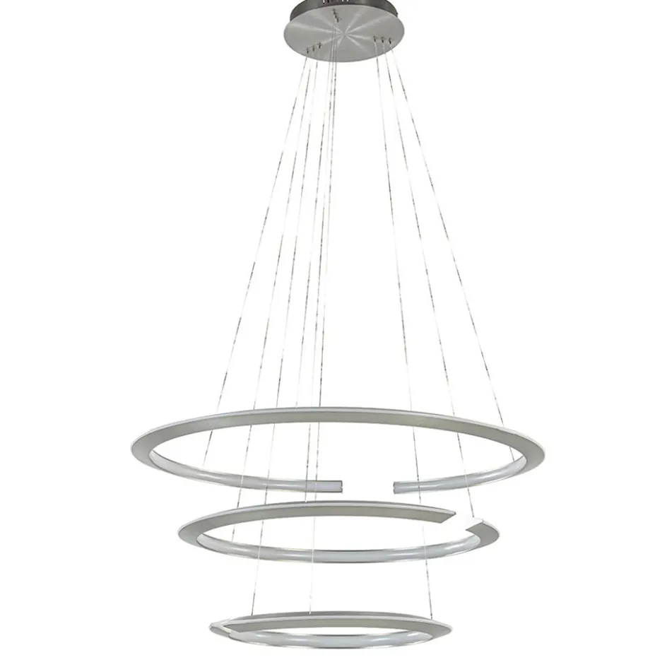 Een grote hanglamp met een uniek design. Deze moderne ronde hanglamp bestaat uit drie nikkel ringen die naar wens op hoogte zijn te hangen. Iedere ring is voorzien van een opening om de lamp nog opener en ruimtelijker te laten ogen. De ringen zijn zowel van binnen als van buiten voorzien van LED strips die met 2700 Kelvin zorgen voor een sfeervolle warm witte verlichting. De ringen hangen aan drie staalkabeltjes die gemakkelijk zijn in te korten. Het leuke aan de ringen is dat deze op verschillende manieren kunnen worden opgehangen. Zo kunt u kiezen om de ringen mooi verdeeld onder elkaar te hangen, maar de ringen kunnen ook schuin hangen zodat ze elkaar overlappen. Op deze wijze ontstaat er een speels lijnenspel en creëert u op eigen wijze een unieke lamp. De moderne LED hanglamp wordt met een ronde bevestiging aan het plafond opgehangen en is dimbaar dmv een externe dimmer (exclusief).