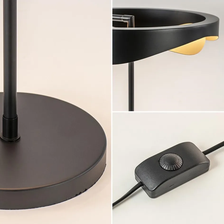 Een moderne tafellamp met een strak design. De LED tafellamp heeft een zwarte armatuur met goud accenten. De ring, die wordt ondersteund door de voet, is van binnen voorzien van geïntegreerd LED welke dimbaar is dmv de dimmer in het snoer. Zo kunt u snel en gemakkelijk de juiste sfeer bepalen en veranderen. De moderne LED tafellamp heeft een zwart snoer met een lengte van 240 cm, waarbij de dimmer zich op 60 cm van de voet bevindt.
