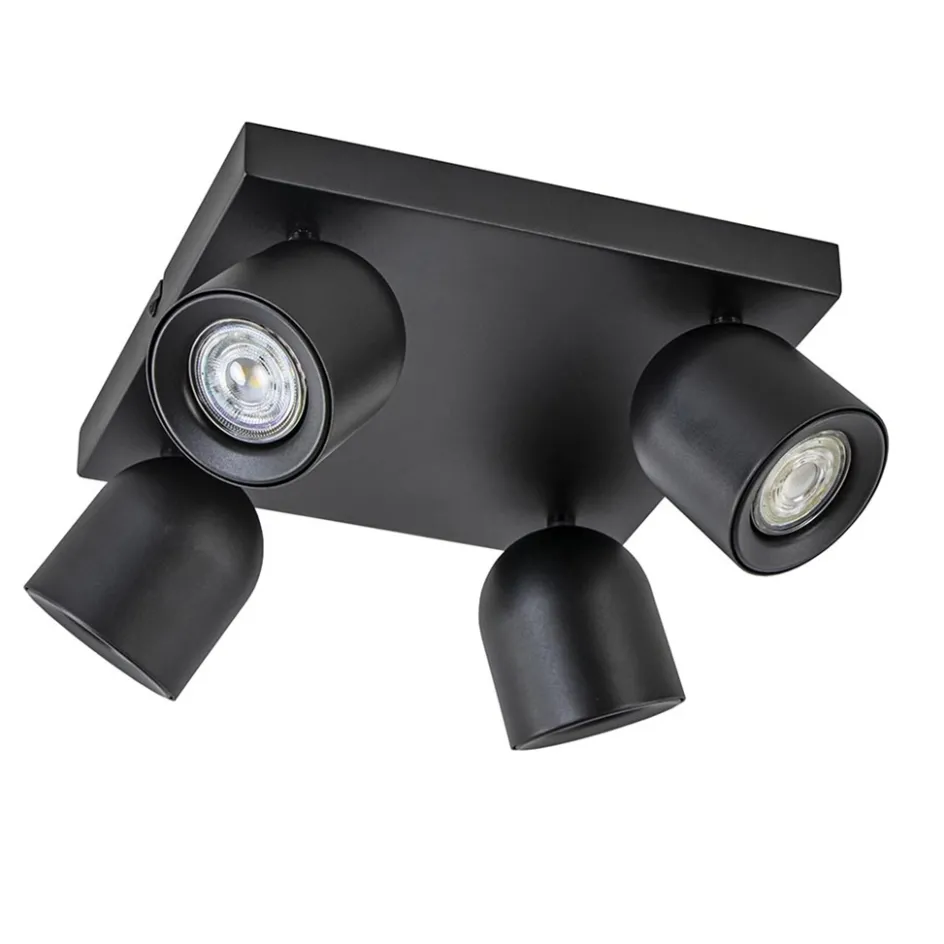 Ideaal voor in een hal, slaapkamer of gewoon als extra sfeer in de woonkamer. Deze 4-lichts opbouwspot kan het allemaal. De spots zijn bevestigd op een vierkante plafondplaat en zijn volledig naar wens te verstellen door deze te draaien en/of te kantelen. De zwarte spots worden geleverd exclusief lichtbron (GU10). De lichtbron wordt gemakkelijk geplaatst door het binnenkapje te verwijderen en weer terug te plaatsen. Leuk aan deze plafondspot is dat er ook een gouden kapje mee wordt geleverd zodat u zelf kunt kiezen welke u wilt toepassen.