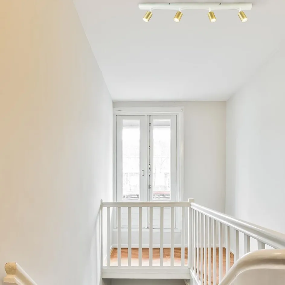 Deze design opbouwspot is een verrijking voor het interieur. De langwerpige plafondspot heeft een mooie afwerking die is uitgevoerd in het mat wit met goud. Deze combinatie maakt de plafondlamp chique en Scandinavisch tegelijk. De 4 cilindervormige spots zijn naar wens te verstellen door deze te draaien en/of te kantelen. Ideaal om zo een hele kamer uit te lichten. De mat witte plafondbalk heeft een lengte van 100 cm en is 8 cm breed. De opbouwspot is dimbaar middels een externe dimmer en wordt geleverd exclusief lichtbron (4x GU10).