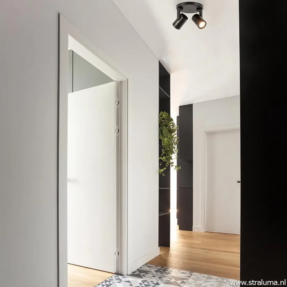Een ronde plafondspot met een strakke vormgeving. De 2-lichts metalen opbouwspot is volledig afgewerkt in een mat zwarte finish waardoor deze een minimalistische look krijgt. Dit wordt extra benadrukt door de strakke pootjes van de spotjes en de platte bevestiging van maar 1,5 cm. De ronde spotjes hebben een afneembare ring die er gemakkelijk kan worden afgedraaid zodat de lichtbron kan worden geplaatst. De spotjes zijn zowel te draaien als te kantelen zodat u deze naar de gewenste richting kunt plaatsen. Ideaal voor in een hal of slaapkamer. De mat zwarte opbouwspot wordt geleverd zonder lichtbron (2x GU10).