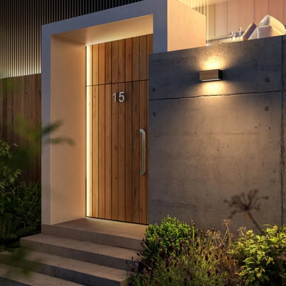 Een prachtige wandlamp voor aan de schuur, schutting of de woning zelf. De buitenlamp is uitgevoerd in het donker grijs met houtlook en fungeert als up en downlighter. De rechthoekige wandlamp is boven en onder afgewerkt met een glasplaat waardoor de lamp goed afsluit. Dit zorgt dan ook dat de buitenlamp IP54 is goedgekeurd. De buitenlamp zorgt voor mooi strijklicht op de ondergrond en geeft wat extra sfeer aan het buitenleven.