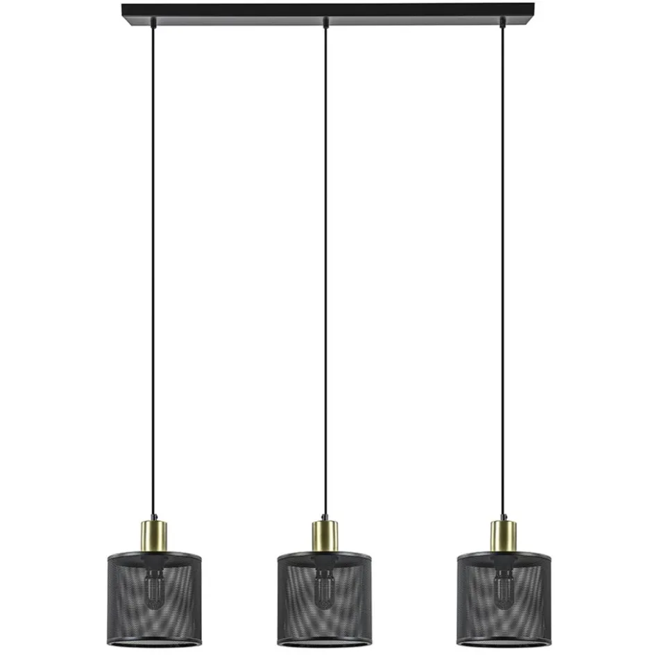 Een stoere 3-lichts hanglamp met een industriële / Scandinavische look. De hanglamp is perfect voor boven een eettafel, bartafel of kookeiland. De hanglamp is voorzien van metalen cilindervormige kappen die zijn uitgevoerd in mat zwart. Dit past mooi bij de zwarte snoeren en de mat zwarte bevestiging. Leuk detail aan de kappen zijn de gouden fittingen. Doordat de kappen van gaas zijn gemaakt zijn ze open van structuur en kan er een goede lichtverspreiding plaatsvinden. Een decoratieve lichtbron is dan ook een mooie optie voor deze eettafelhanglamp. De kappen zijn gemakkelijk naar wens op hoogte te hangen, de maximale hoogte van de lamp is 150 cm. De mat zwarte hanglamp met goud wordt geleverd zonder lichtbron en is dimbaar middels een externe dimmer (exclusief).