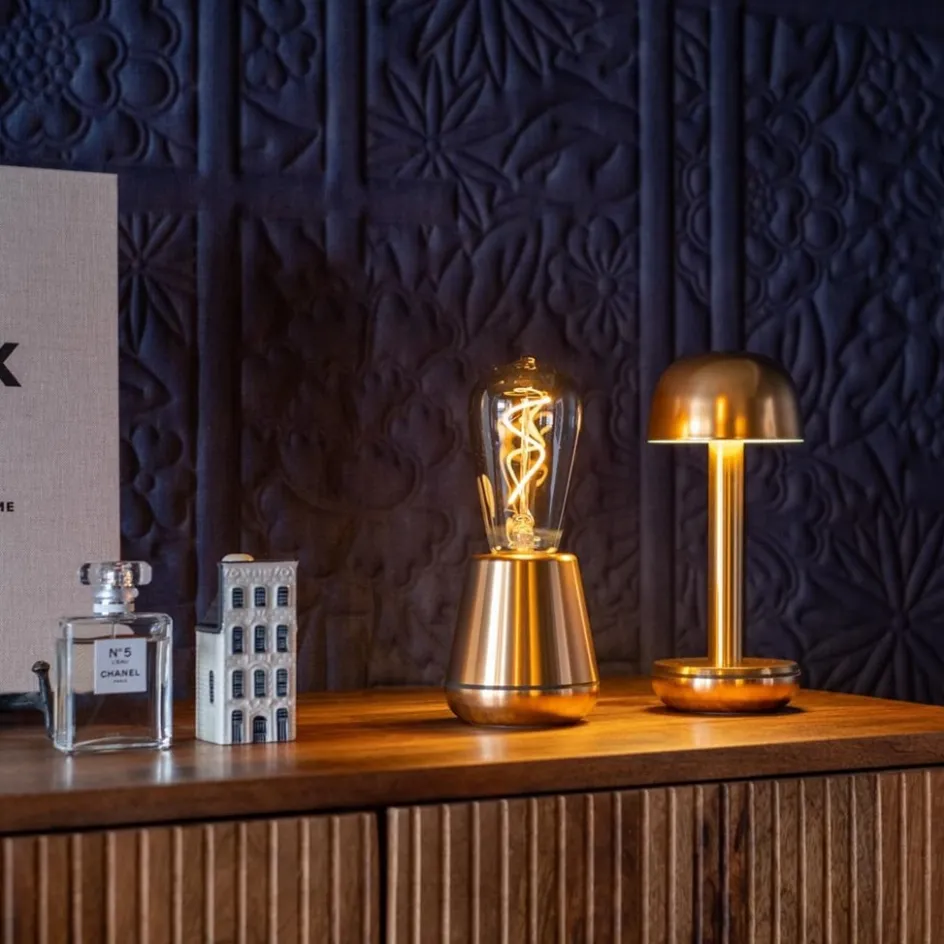 Wat een super leuke sfeermaker is dit. Deze kleine tafellamp is een ideale toevoeging aan het interieur en kan overal worden neergezet. Het tafellampje is namelijk voorzien van een oplaadbare accu zodat hij prima zonder snoer kan functioneren, tot wel 140 uur. De tafellamp heeft een gouden voetje en is gecombineerd met een E27 LED lichtbron in het smoke. Deze lichtbron is vervangbaar en dimbaar. Het voetje heeft een ingebouwde dimmer die werkt in 3 standen. Met de knop onderop schakelt u gemakkelijk tussen de standen candle, ambient en work. Daarnaast ziet u aan de onderzijde dmv lampjes ook hoe vol de batterij nog is. Raakt deze bijna leeg, dan laadt u de lamp gemakkelijk op met de meegeleverd USB kabel, of één van de beschikbare draadloze chargers (exclusief). De kleine tafellamp is IP43 goedgekeurd, een beetje spatwater kan dus geen kwaad. Zet de tafellamp op een bijzettafel, in een kast of neem hem mee naar uw tuin of balkon. Waar de draadloze lamp ook staat, hij zorgt voor een fijne sfeer. Er zit zelfs een opbergzak bij zodat hij ook mee kan op reis.