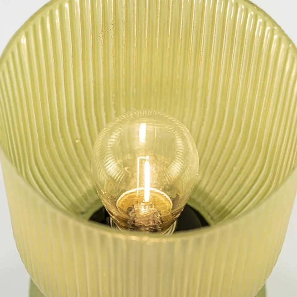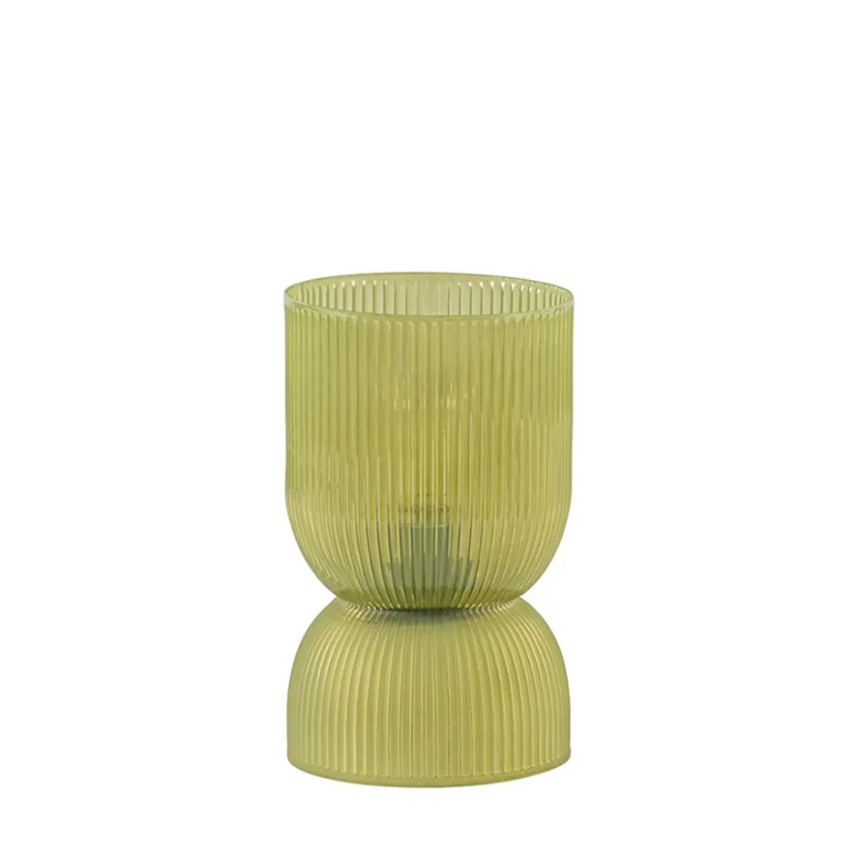 Tafellamp gemaakt van licht olijf groen ribbelglas. Het tafellampje heeft de vorm van een diabolo. Bij de voet is het ribbelglas mat, het bovenste deel van het glas heeft een subtiele glans. Prachtig op een slaapkamer, op de salontafel of een tiener of studentenkamer. Dit lampje werkt op 2x AAA batterijen, dus het is overal te gebruiken. Mooi in een landelijk, romantisch of botanisch interieur.