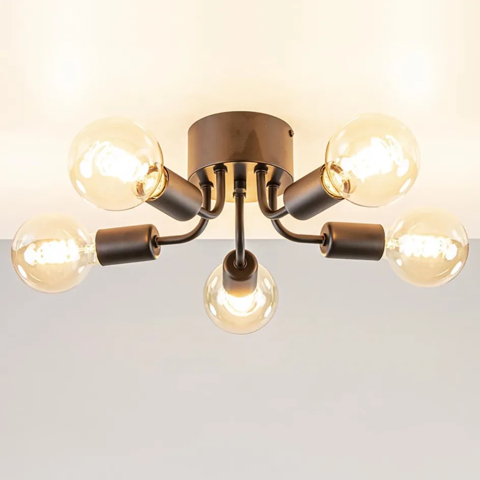 Bent u op zoek naar dé geschikte plafondlamp voor in uw kamer? Dan is deze plafondlamp 5-lichts zwart precies waar u naar op zoek bent! Deze mat zwarte plafondlamp is een echte sfeerbrenger in huis. Het is aan u welke sfeer deze lamp met zich mee zal gaan brengen. Waarom vraagt u zich af? Deze 5-lichts plafondlamp wordt geleverd exclusief lichtbronnen, wat betekent dat u dé juiste lichtbronnen uit moet kiezen naar uw smaak! Zo kunt u bijvoorbeeld de keuze maken uit smoke-lichtbronnen of gold-lichtbronnen. De smoke-lichtbronnen geven door hun donkere glans een vooral moderne en chique uitstraling. De gold-lichtbronnen geven daarentegen warm en sfeervol licht. Houdt u van een chique stijl? Deze plafondlamp 5-lichts is ook verkrijgbaar met gouden fittingen! Aan u de keuze!