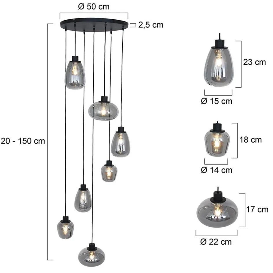 Modern, stoer en strak inéén. Deze 7-lichts hanglamp is een perfecte toevoeging aan een vide. De zwarte hanglamp heeft namelijk een hoogte van maximaal 3,5 meter. Dit zorgt ervoor dat de 7 glazen kappen mooi kunnen worden verdeeld over de hoogte. Dit kan in een spiraal vorm of speels door elkaar. De 7 kappen zijn vervaardigd uit hoogwaardig smoke glas wat de videlamp een luxe uitstraling geeft. De hanglamp is voorzien van 3 verschillende type glazen die mooi kunnen worden verdeeld over de lamp. Ieder glas wordt ondersteund door een stevige zwart metalen fitting en hangt aan zwarte stofomwonden snoeren. De zwarte videlamp met smoke glas wordt aan het plafondlamp bevestigd met een ronde plafondplaat van Ø 50 cm. De lichtbronnen zijn exclusief.